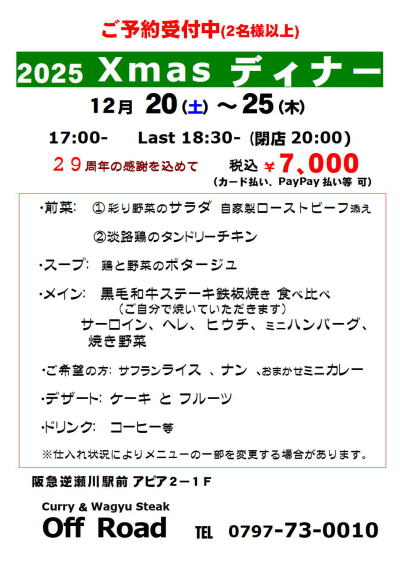 | 06.01 | オフロードの日発足。 毎週火曜と金曜の夜はオフロードの日とし、特別めにゅーや無料デザートのサービスをいたします、 |